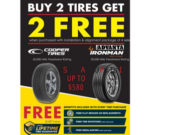 BUY 2 GET 2 FREE TIRES! With the purchase of a wheel alignment on selected tires. Advanta and Cooper tires all backed with Midas NATION WIDE warranty!